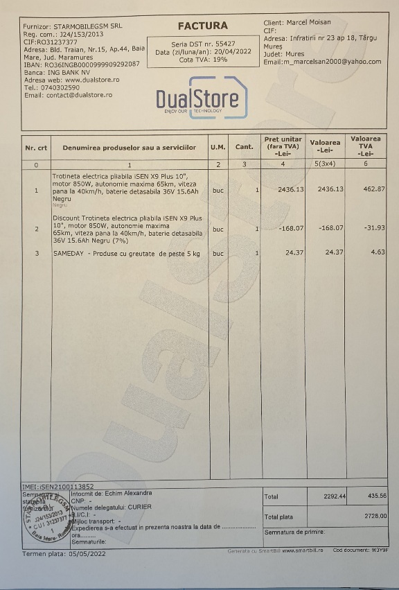 Modalitățile de plată disponibile pe DualStore sunt: ramburs, transfer bancar, plată online cu cardul, plată în rate. Transportul este gratuit la comenzile de peste 799 lei iar termenul de retur este de 14 zile de la primirea produsului.