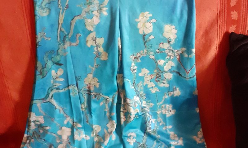 Dar sunt profund dezamăgită de produs. Rochia e largă, nu e material elastic așa cum o prezintă ei, ci o chestie mătăsoasă care nu se mulează deloc pe corp. Are o cusătură în plus față de ce arată ei în poză, practic e un tipar diferit. Imprimeul, care trebuia să reprezinte cireșii înfloriți ai lui Van Gogh, e un desen trist și expandat. Sincer, n-aș purta așa ceva nici prin casă, la curățenie. 🙂
