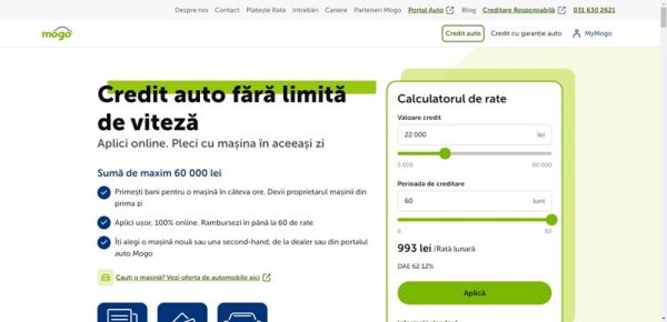Mogo.ro este o companie ce oferă împrumuturi ce pot fi rambursate cu ușurință. Compania oferă diferite împrumuturi pentru achiziția de mașini de orice vehchime, model sau marcă. Credite cu ușurință online, se oferă o sumă de până la 75% din valoarea bunului, evaluarea fiind gratis. Suma minimă a împrumutului este de 25.000 lei iar suma maximă este de 45.000 lei. Perioada minimă fiind de 6 luni și maximă de 60 luni. După completarea formularului vei primi un raspuns în maxim 15 minute. Pe site se poate calcula sumele prin introducerea unor date precum prețul vehicului, cât se poate plăti în avans și plata lunară. Compania este una de încredere, peste 50.000 de clienți beneficiază de credite auto și leasing în cinci țări. Compania face parte din grupul Mogo AS, fondat în anul 2012. Compania activează în țări precum Bulgaria, Polonia, Gerogia, Lituania, Estonia și România.
