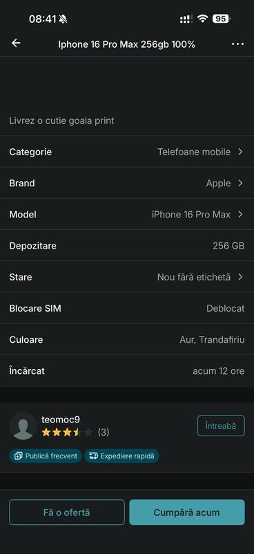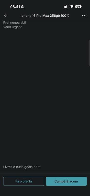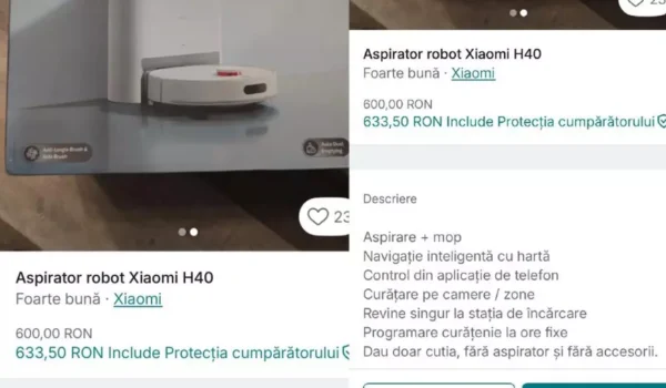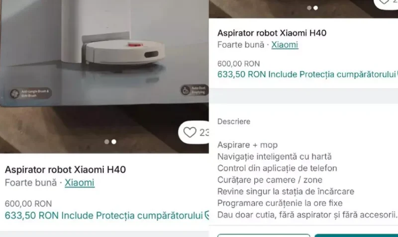 Titlurile anunțurilor sunt sugestive. De exemplu „Aspirator Robot”, „iPhone 16 Pro Max”. Ceea ce poate atrage cumpărători, dar descrierea conține mențiuni mai discrete că este vorba doar de cutie.